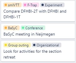 Let's look at a few cards on my board. The first task below is an experiment I will do for my synthetic cell project (smIVTT) on a setup called F-Trap. The second card refers to the upcoming BaSyC consortium symposia I will attend at Radboud University (Nijmegen). Finally, I am one of the retreat organizers for my and a few other labs in the department [4]. My responsibility there is to find fun group activities to do on Texel.