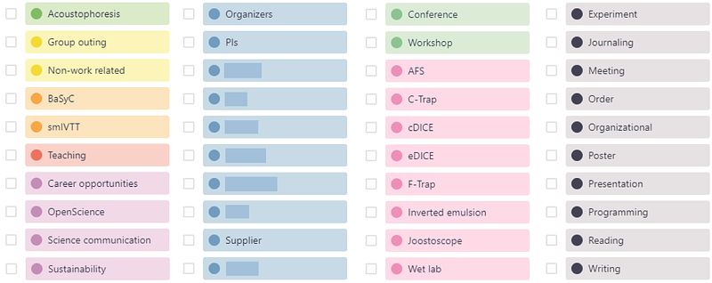 These labels have different colors, depending on what they designate. Some colors are used for a large group of labels: such as the experimental setups I will need to use for a particular experiment (a set of pink labels) or the person I should discuss/do it with (a bunch of blue labels with names hidden for privacy reasons). Others are more unique, like the red one, which explicitly marks everything teaching-related, or the orange one, which concerns the Building a Synthetic Cell (BaSyC) consortium [3] and my project as a part of it.