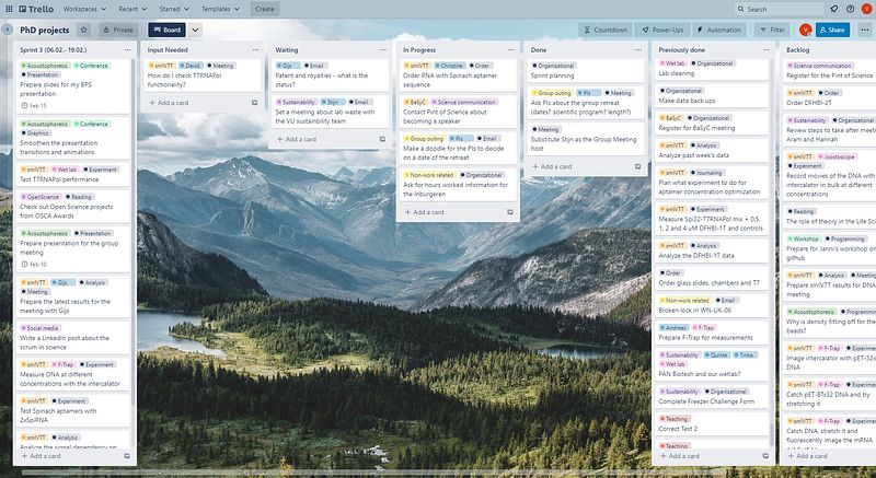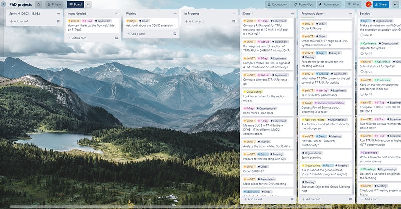 It's been a year since I adapted this agile-inspired combination of short sprints and visualization of tasks for my PhD. And it has been incredibly helpful in tracking my research progress, prioritizing experiments to do next, and planning the upcoming weeks. Plus, seeing the board empty at the end of the sprint is a very satisfying feeling. PhDs often feel stuck in place even though we work very hard. Tracking progress like that gave me an accurate picture of my progress and helped defeat the imposter syndrome.